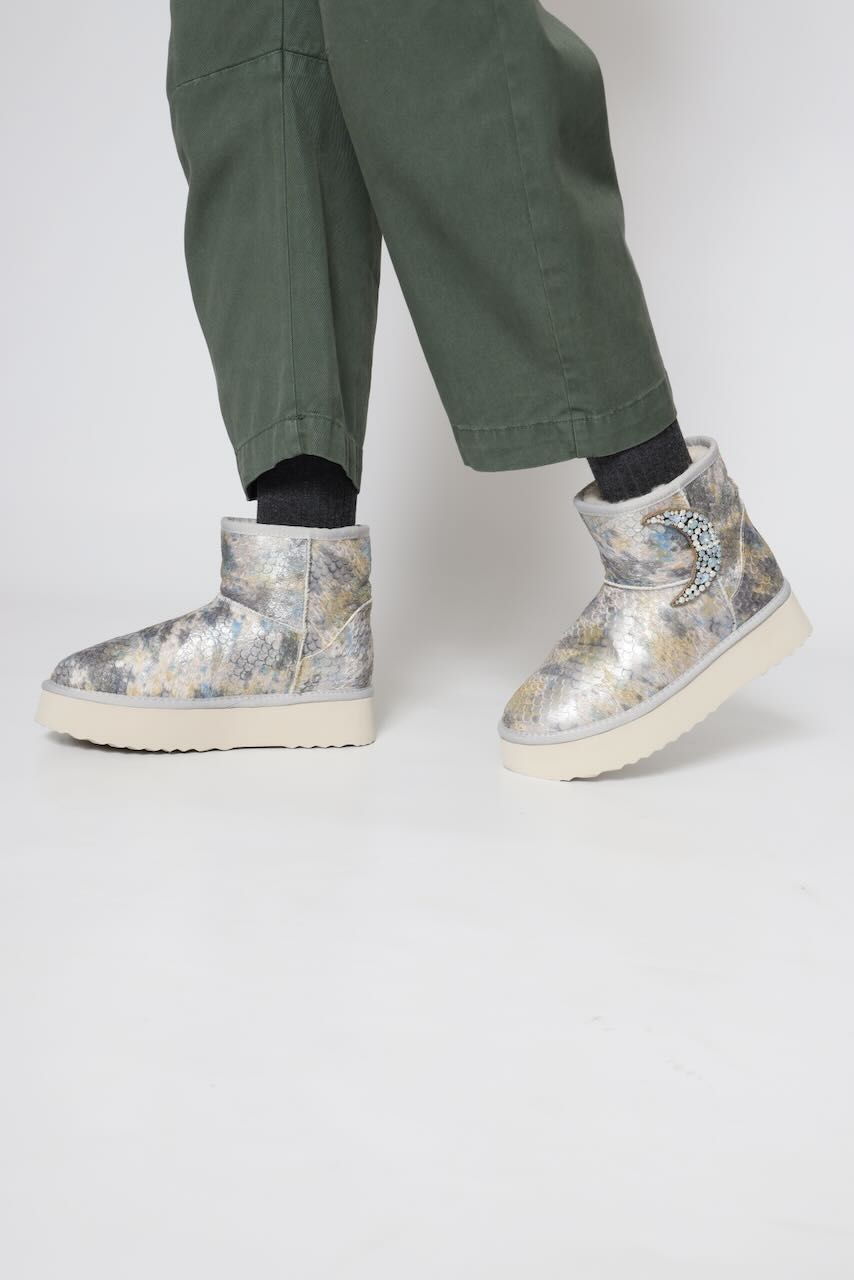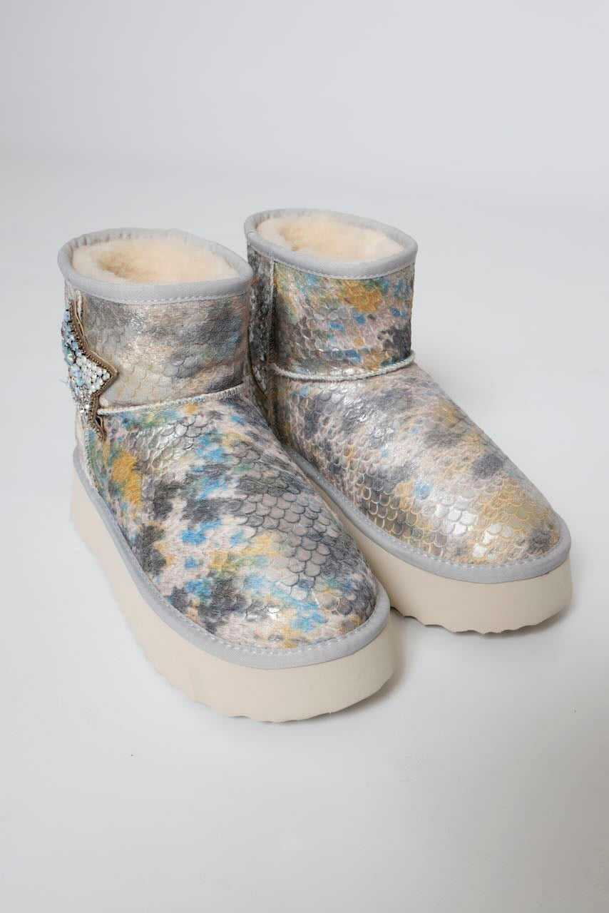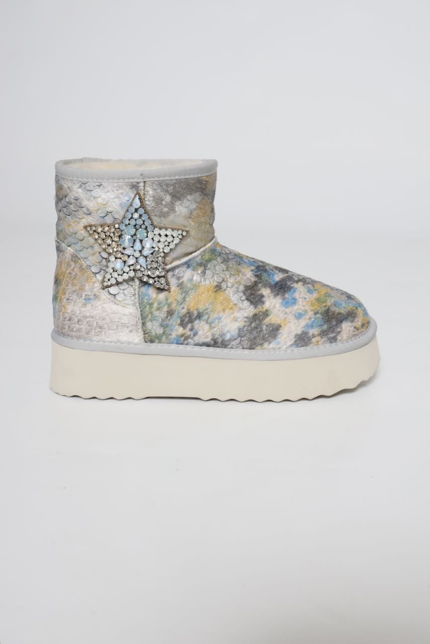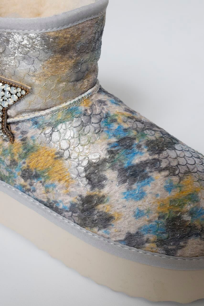 Botín de pelo con detalles de pedrería, en la bota derecha una estrella. La altura de la suela es de 3,5cm y la caña mide 11cm.