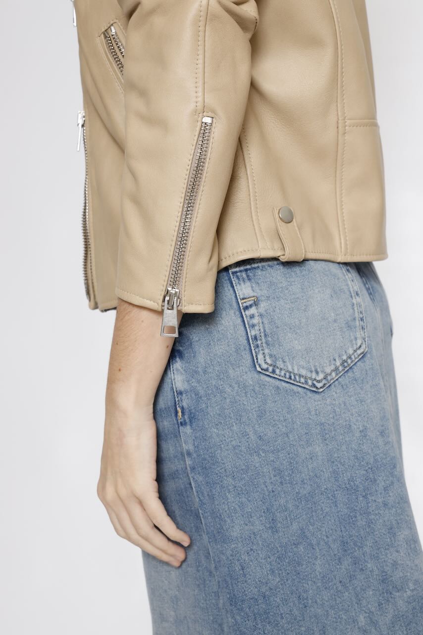 Descripción: Cazadora de cuero en color taupe con estilo biker, perfecta para cualquier ocasión.
