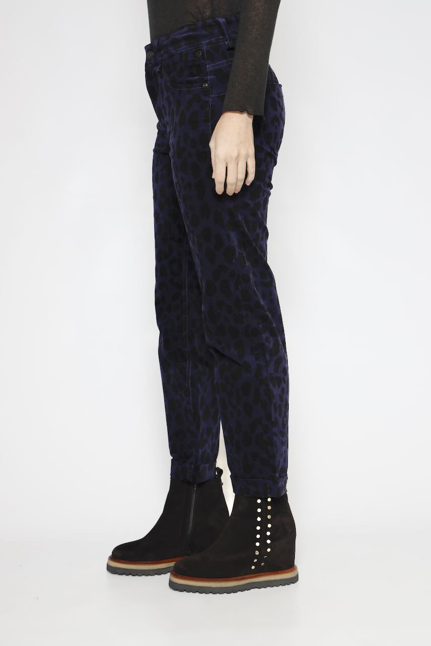 Pantalón de corte boyfriend recto y altura de cintura normal, tiro ligeramente bajo. Confeccionado en pana elástica y con estampado de leopardo que añade un toque de estilo a cualquier outfit.