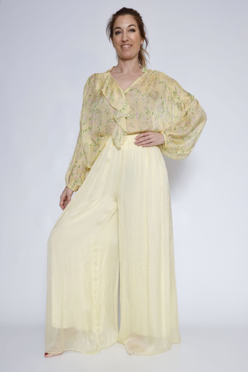Esta hermosa blusa con estampado de flores en tonos amarillos es el complemento perfecto para tu armario primaveral. Confeccionada con un 70% de viscosa y un 30% de seda, esta blusa combina comodidad y estilo en una sola prenda.