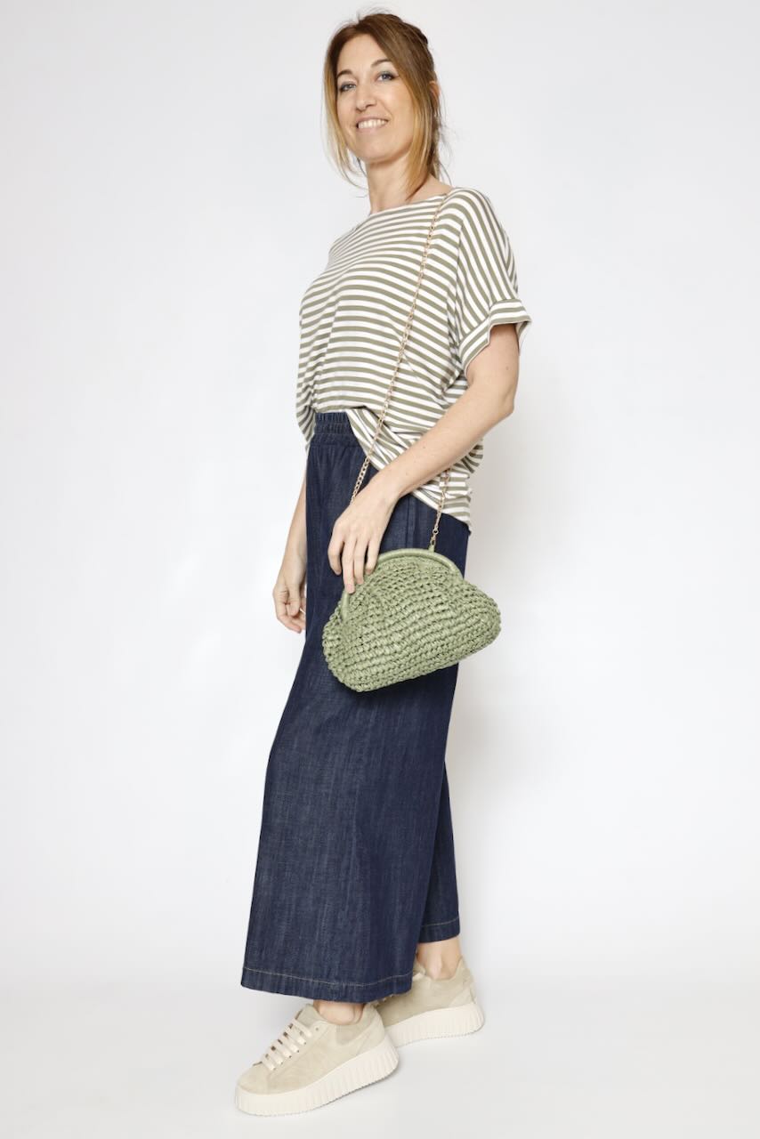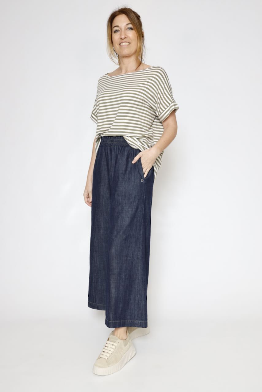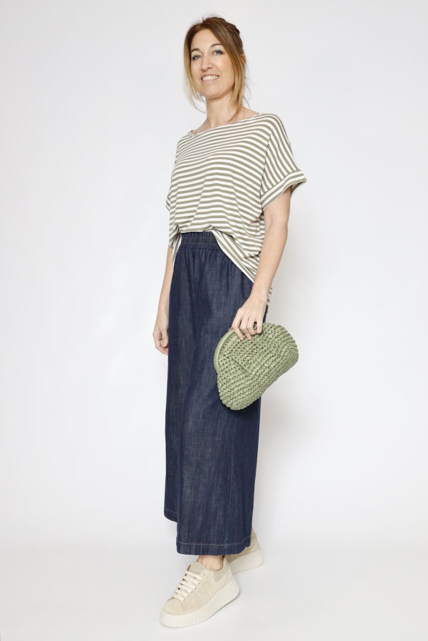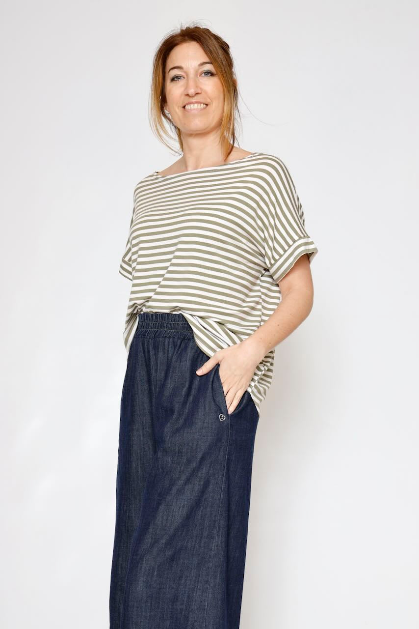 Camiseta holgada estilo oversize con hombros caídos, lo que le otorga un aire relajado y cómodo. Escote tipo barco, muy favorecedor, mangas cortas y tejido fluido.