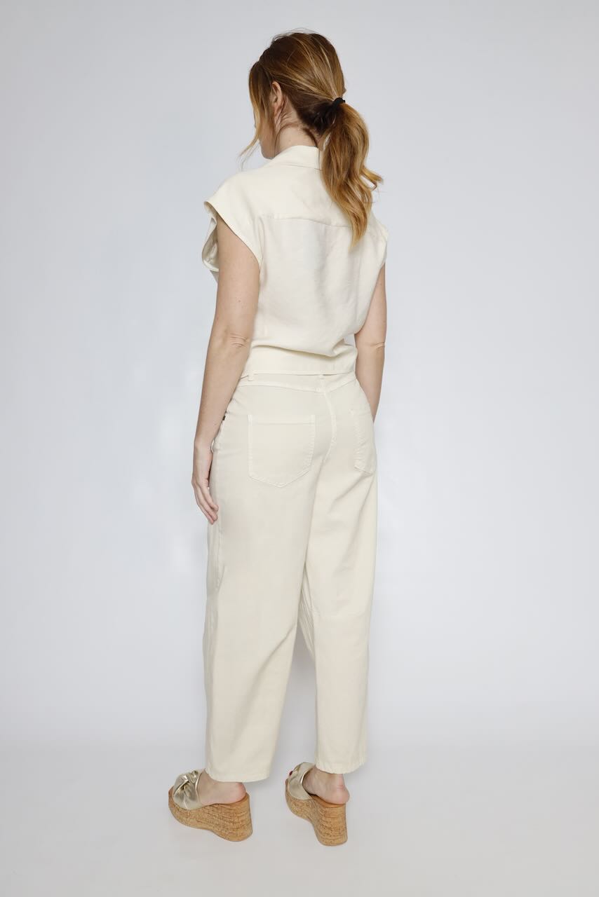 Esta elegante blusa en color latte cuenta con una delicada lazada frontal y prácticos bolsillos, perfecta para cualquier ocasión.
