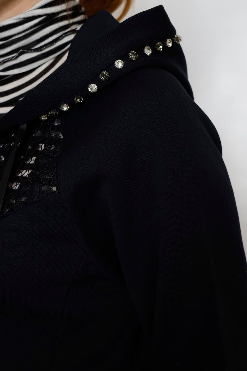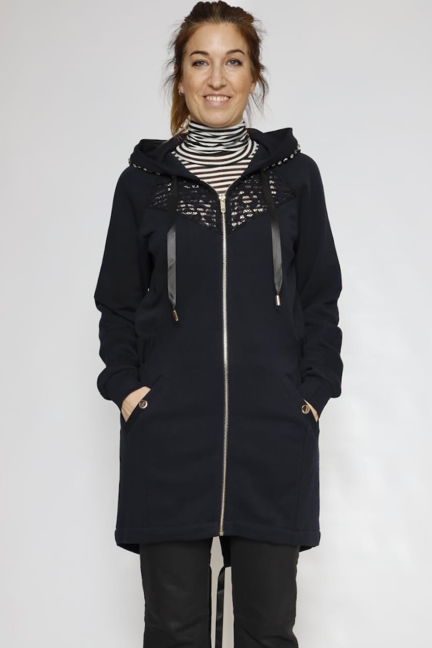 Chaqueta corte regular con capucha con apliques de piedras. Detalles de encaje, cremallera central para abrir, bolsillos laterales y mangas largas.