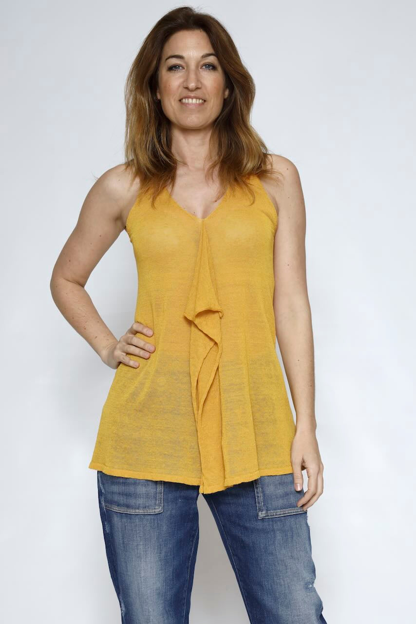 Este artículo de ropa en color amarillo está compuesto por un 83% de lino y un 17% de poliamida. Es una prenda de alta calidad y diseño moderno que te hará lucir elegante y a la moda.