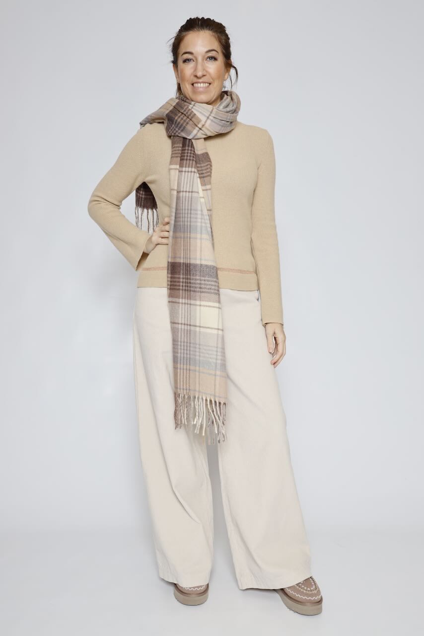 Esta bufanda es el complemento perfecto para mantenerte abrigado y a la moda en los días fríos. Sus cuadros en tonos marrones le dan un toque clásico y elegante a cualquier outfit.