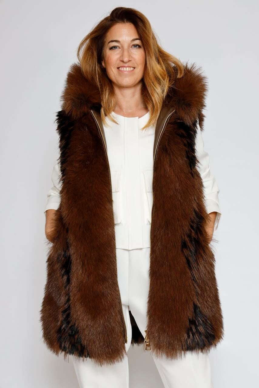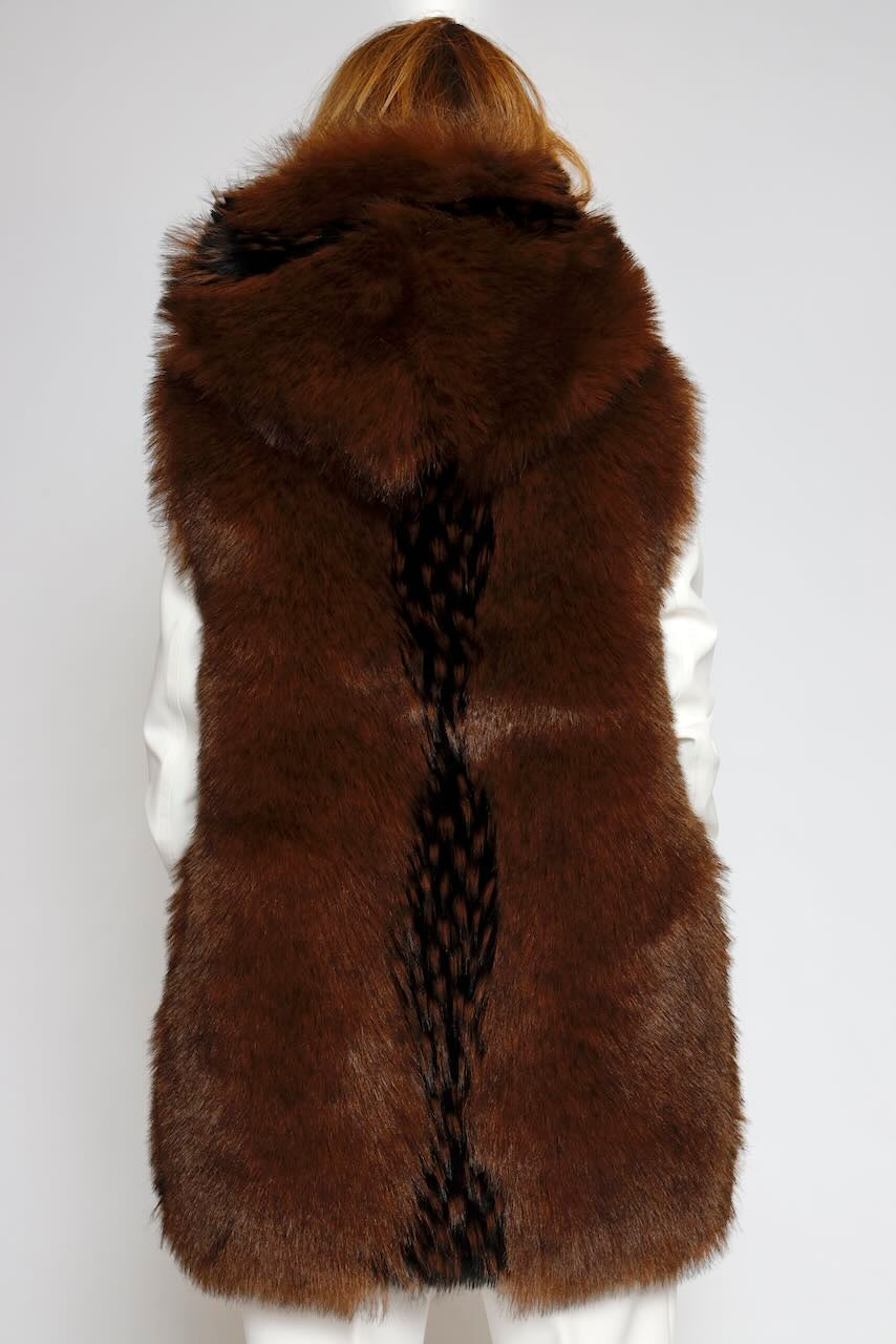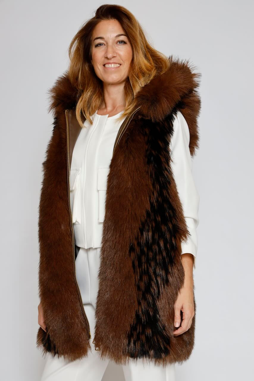 Chaqueta larga sin mangas regular fit confeccionada en pelo sintético con capucha y abertura central.