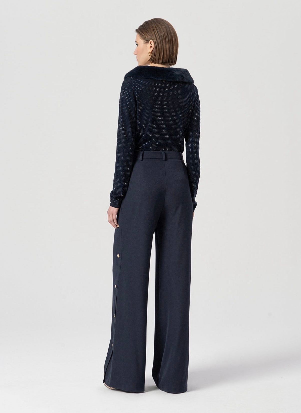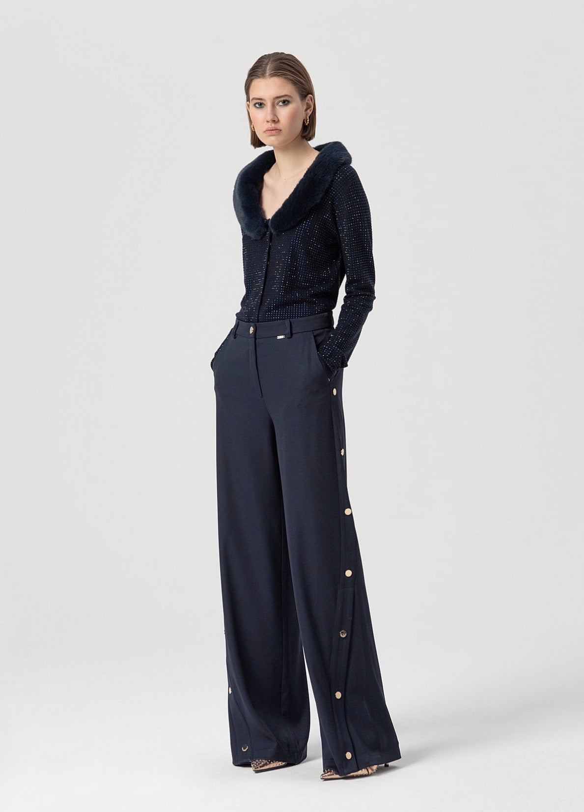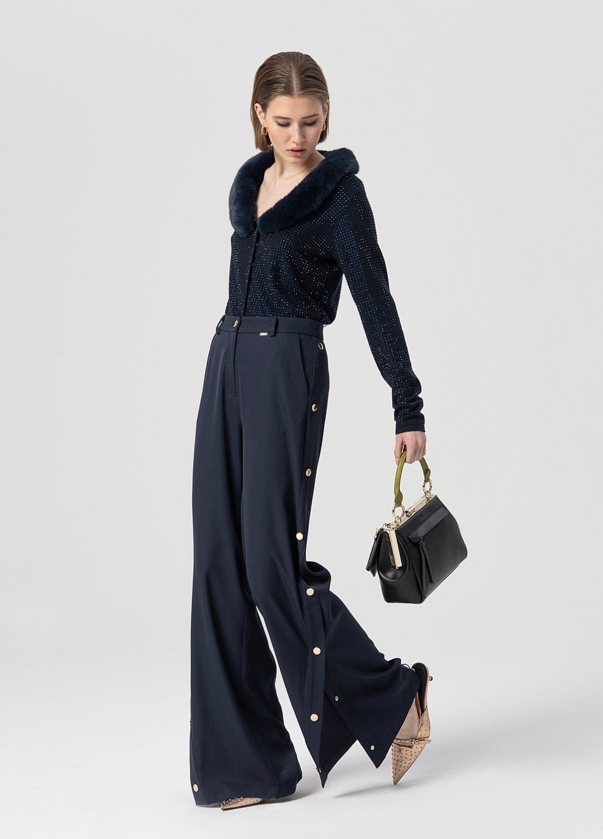 Descubre la comodidad y estilo con nuestro Pantalón Palazzo Acampanado. Este pantalón de talle bajo presenta bolsillos franceses, botones laterales y una pernera ancha que le brindan un toque moderno y elegante.
